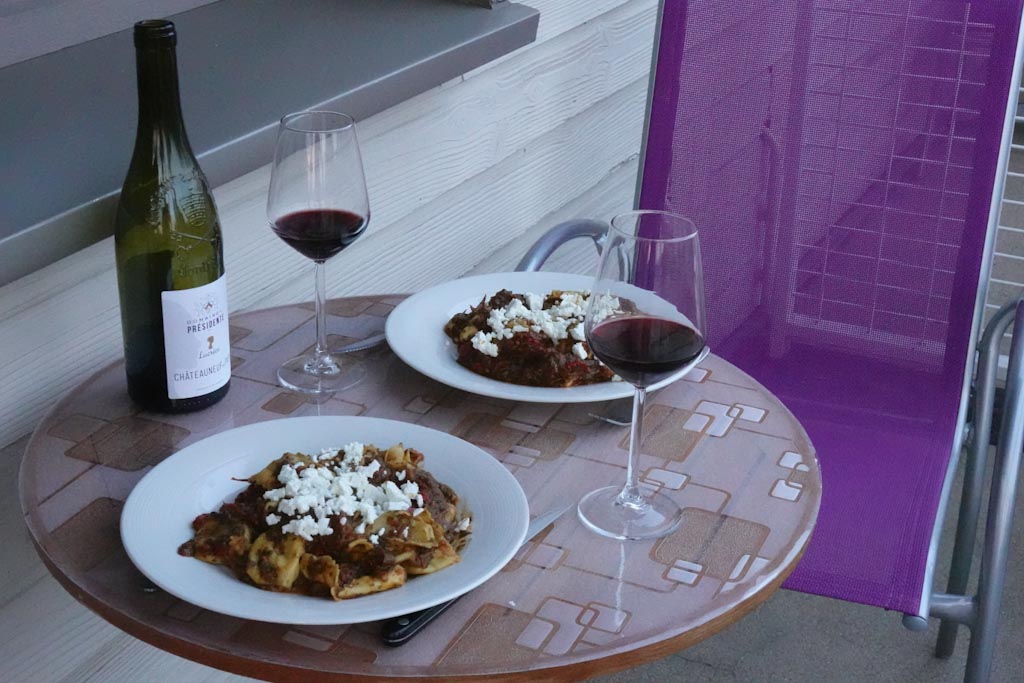 And then, taking full advantage of our barely equipped kitchenette, Neil puts together a pasta meal, accompanied by a fine Chateuneuf du pape.