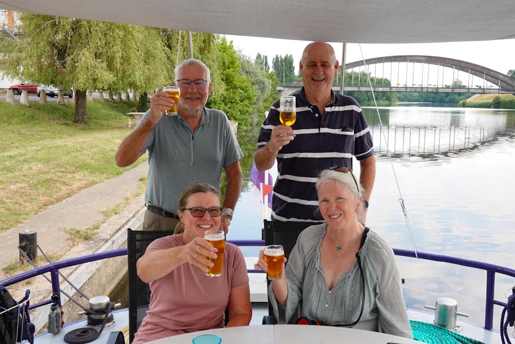 At the end of a day’s ride, our tradition is to enjoy a beer, and to photograph it for posterity. Today’s beer picture was taken on Deb and Harold’s boat and with Michelle and Steve, who’ve been riding west from Basel, while we’ve been riding east from Saint-Brevins-les-Pins. We met in the middle with zero days to spare. The beer is courtesy of Harold’s well-stocked fridge on their well-appointed barge.