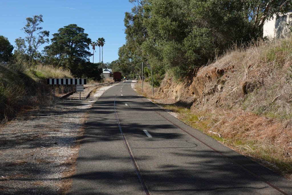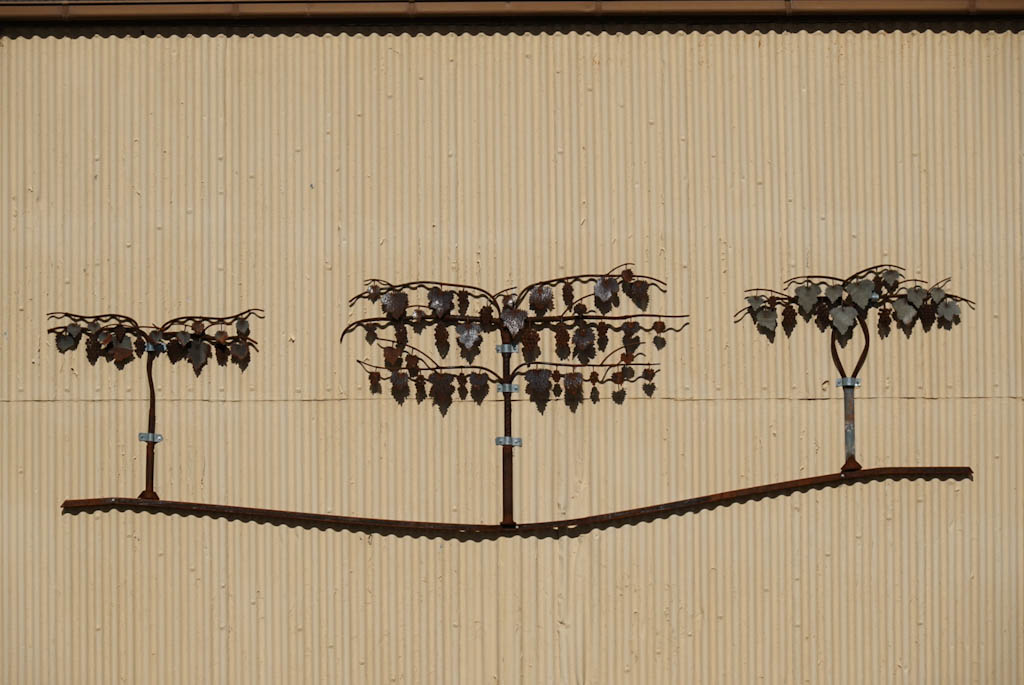 We almost have the rural roads to ourselves, save the odd vehicle beyond John in the mini bus, but when we turn onto the main road into Nuriootpa it’s a slightly different story. We scurry through the streets of Nooriutpa until we reach the safety of the Barossa Trail. This is a pretty spiffy trail, sealed all the way, with sculptures and detailed intrpretive signs along the 7km length we cycle. (This section of the trail is 13km but we do only the 7km between Nuriootpa and Angaston).