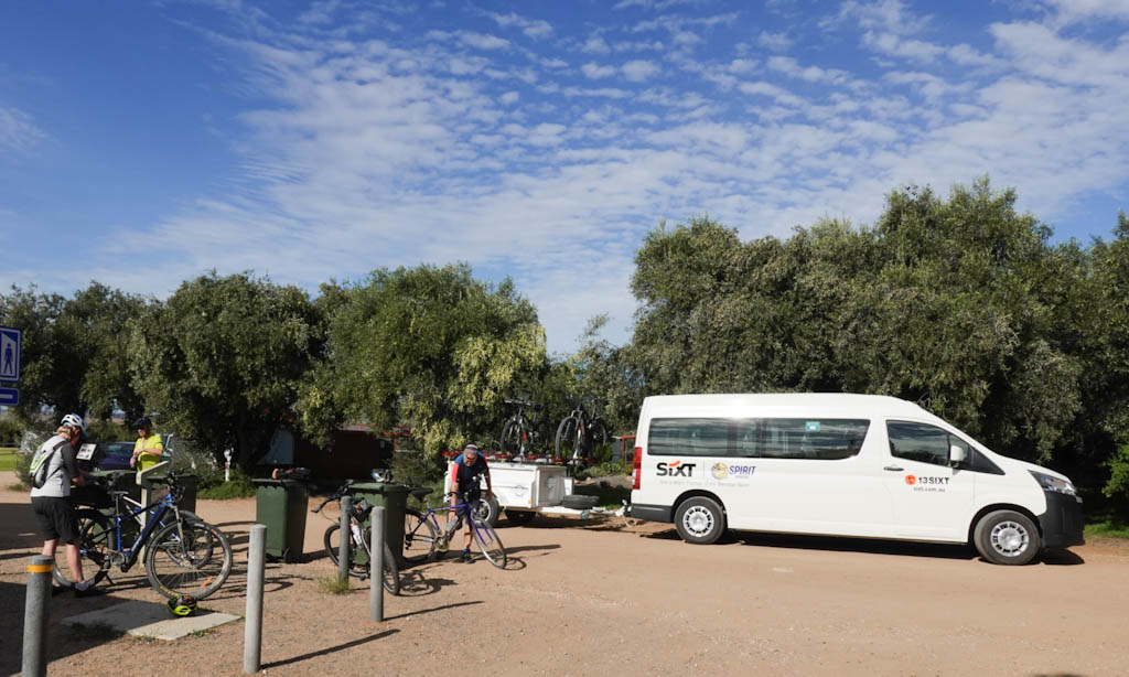 In Murray Bridge we search in vain for a café for lunch, our group being very hungry after our hot and dusty ride. Sadly, we find no cafés in the main part of town and have to resort to the shopping centre, our bikes stacked inside against a wall, and our tables with a line of sight to the bikes. I hate to be too judgy, but there seemed a few characters around who may have enjoyed a new bike.
