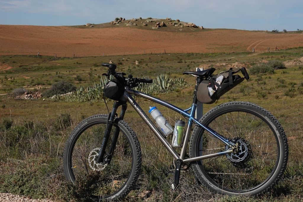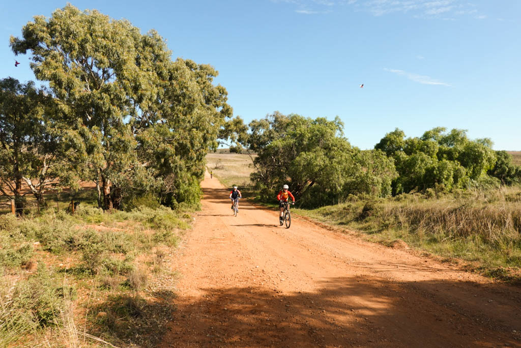 We ride out of Palmer on the road to Murray Bridge, then turn onto a lovely, undulating, red dirt road. With some small efforts to go up, we’re rewarded with fun downhills.